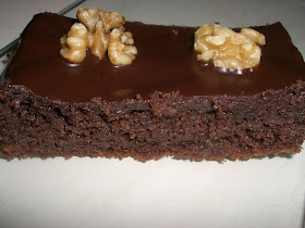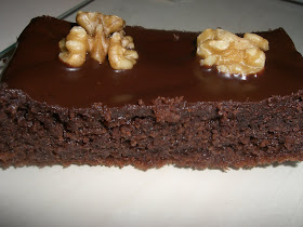 Después he napado el bizcocho ya frío, con una tableta de chocolate fundido con una cucharada de nata líquida ( en mi caso le he puesto un poco de mantequilla, para que se mantenga mejor el choco en el viaje). Encima he colocado nueces, y he partido en forma de pastelitos, muy adecuados para cuando tenemos invitados, para llevar o para congelar...y tener un pastelito delicioso y apto para dieta de bajo índice glu´cemico, siempre a mano.
