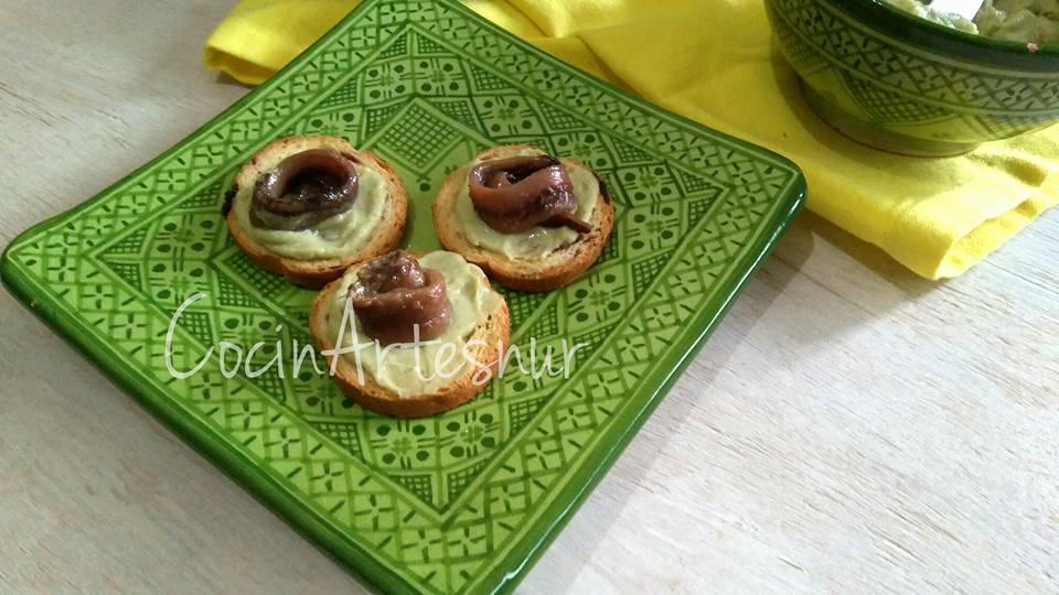 Extendemos sobre la tosta. Enrollamos sobre ella una anchoa.
